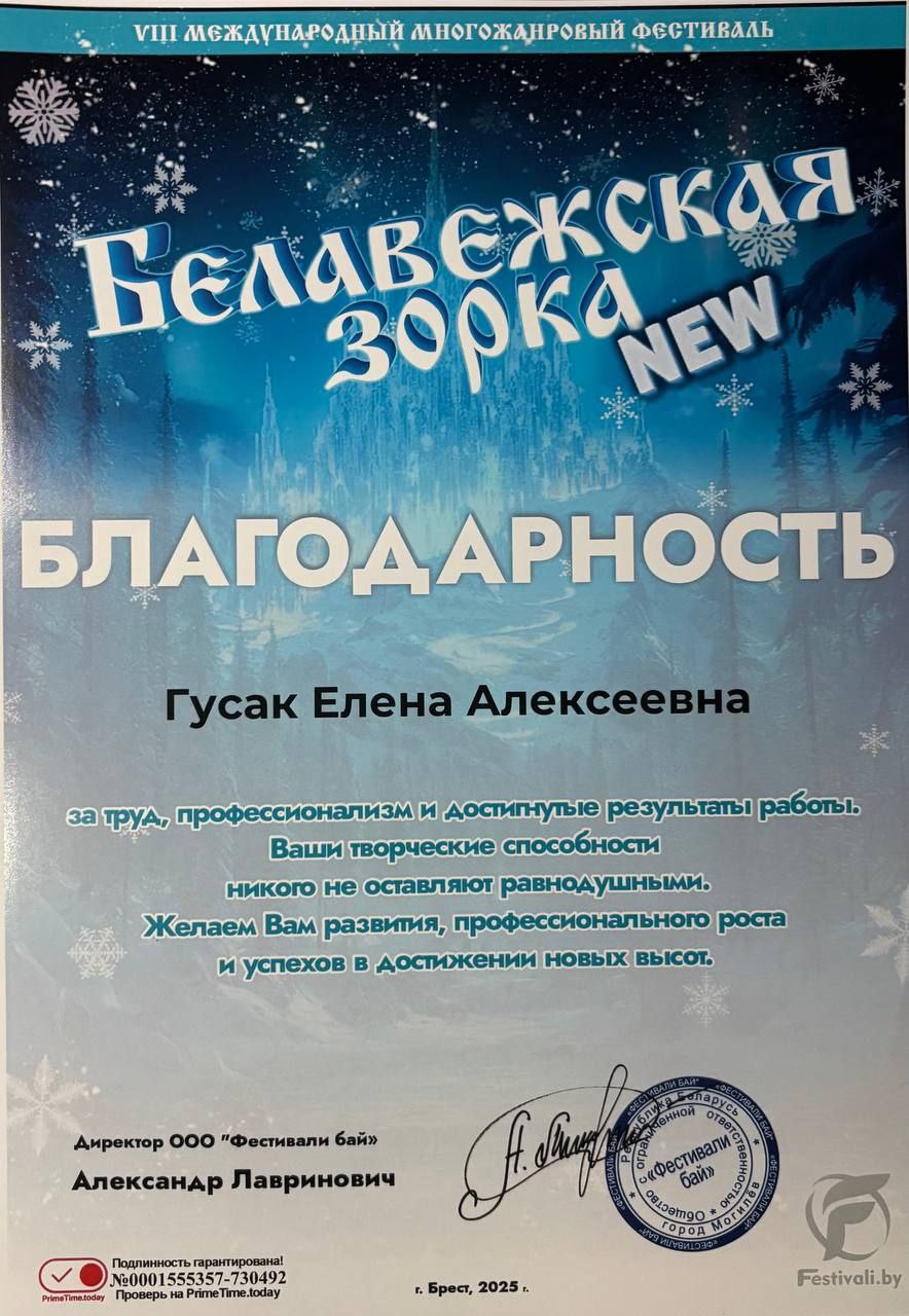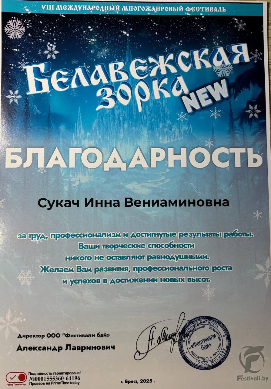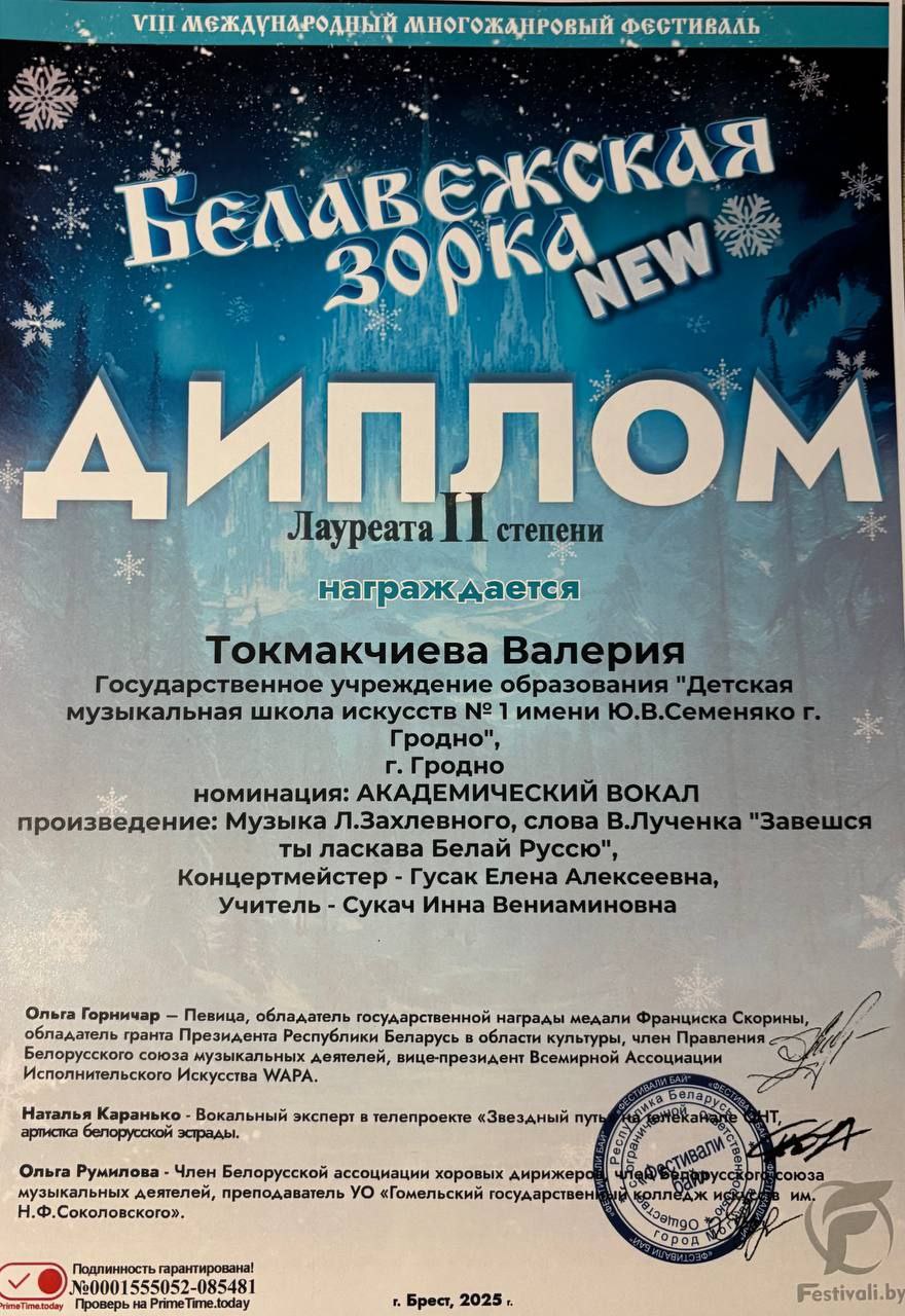 В городе Брест прошел XIII Международный многожанровый фестиваль «Белавежская Зорка», где учащаяся нашей школы Токмакчиева Валерия показала отличный результат!