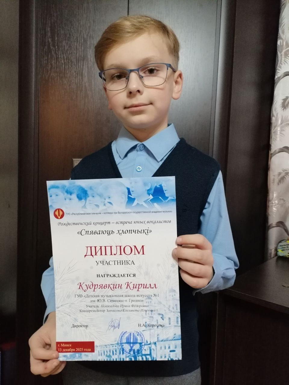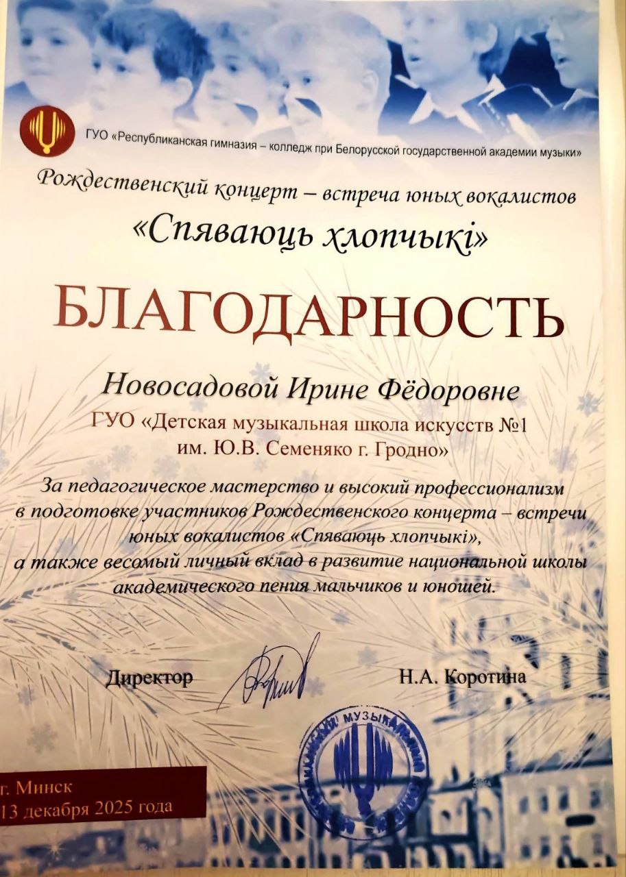 По результатам X Республиканского конкурса юных вокалистов " Спяваюць хлопчыкi" состоявшегося 22 марта 2025 года, учащийся нашей школы, Кудрявкин Кирилл, получивший диплом Лауреата III ст ( учитель Новосадова Ирина Федоровна), был приглашен на Рождественский концерт- встречу юных вокалистов "Спяваюць хлопчыкi", состоявшийся 13 декабря 2025 года г.Минск ( Республиканская гимназия - колледж при Белорусской государственной академии музыки") .